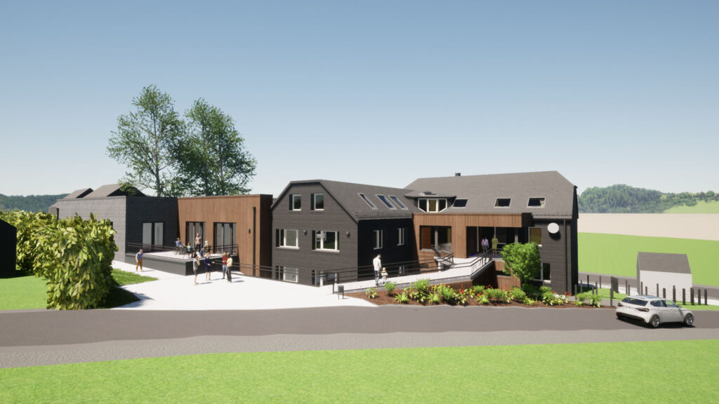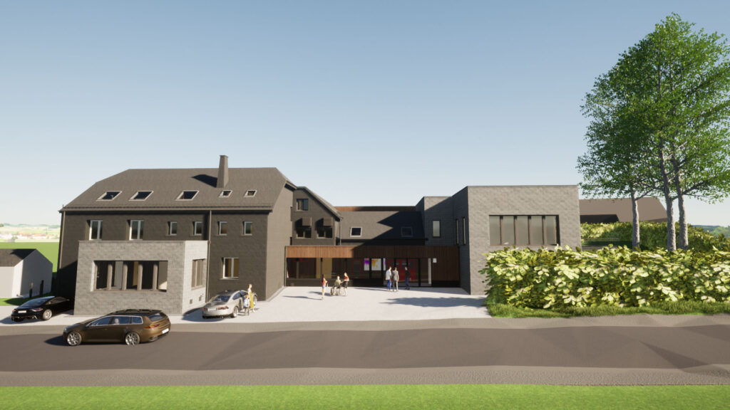 Das historische Gebäude, ein ehemaliges Gemeindehaus, bleibt das zentrale Element des Projekts. Ein moderner Anbau wird sich an den bestehenden Bau anschließen und das Gebäude um drei Ebenen erweitern. Der Innenhof und zwei Terrassen bieten den Bewohnern in den wärmeren Monaten mehr Platz für Aktivitäten im Freien. Neue, größere Ateliers für kreative und handwerkliche Tätigkeiten sowie ein erweiterter Lagerraum schaffen zusätzliche Kapazitäten.