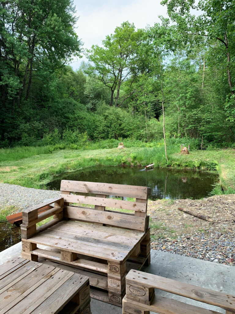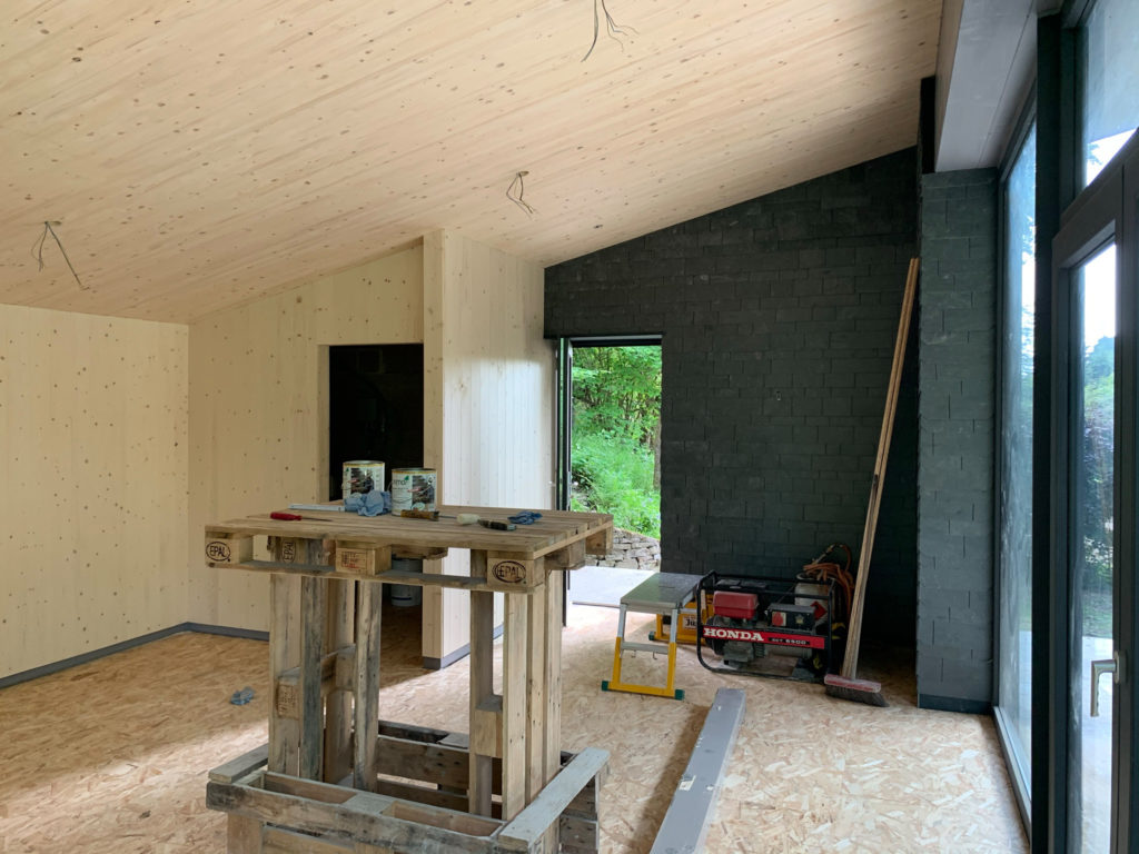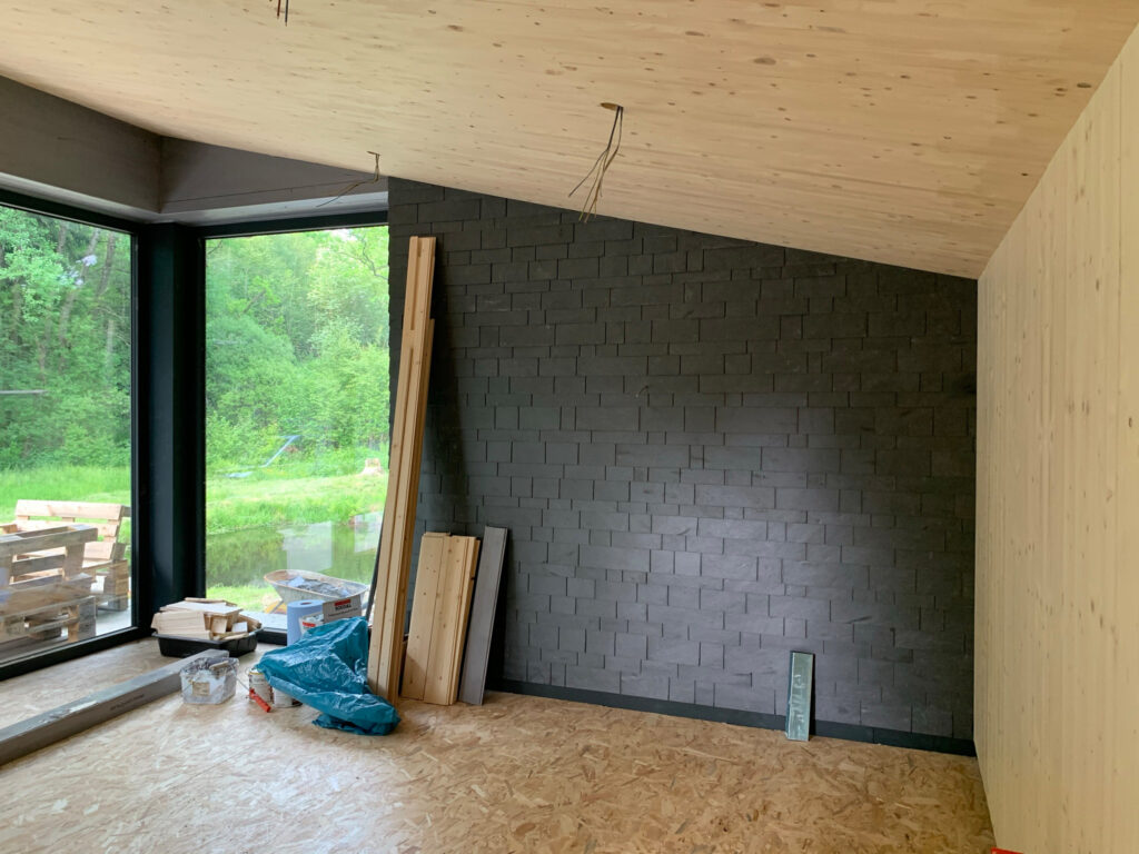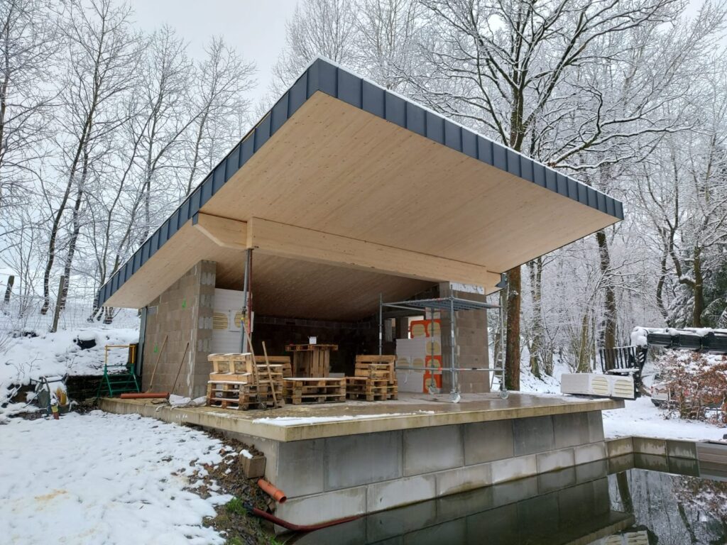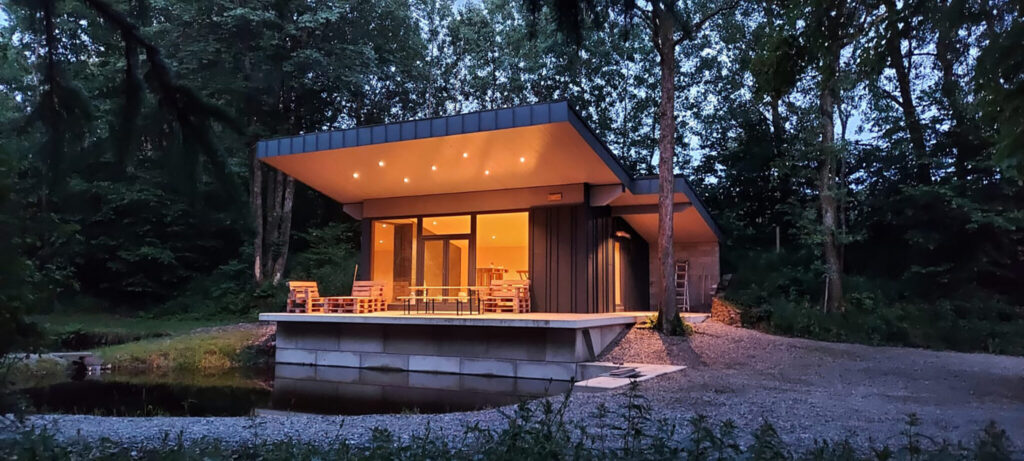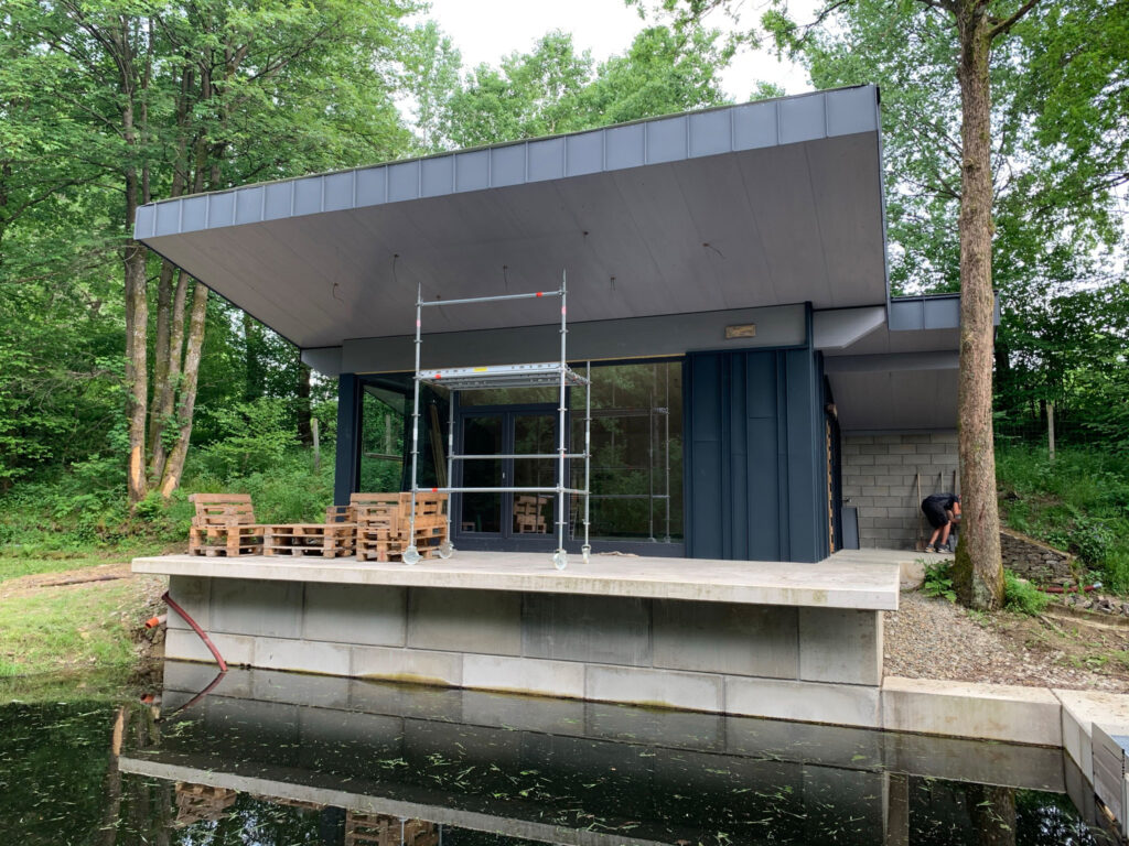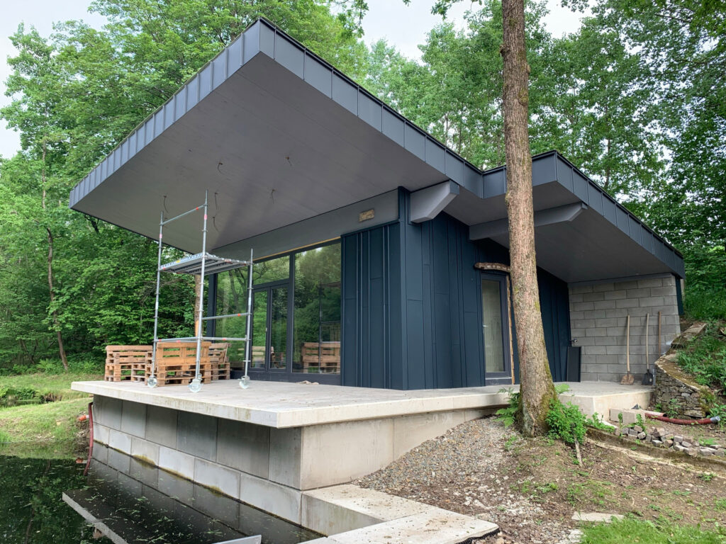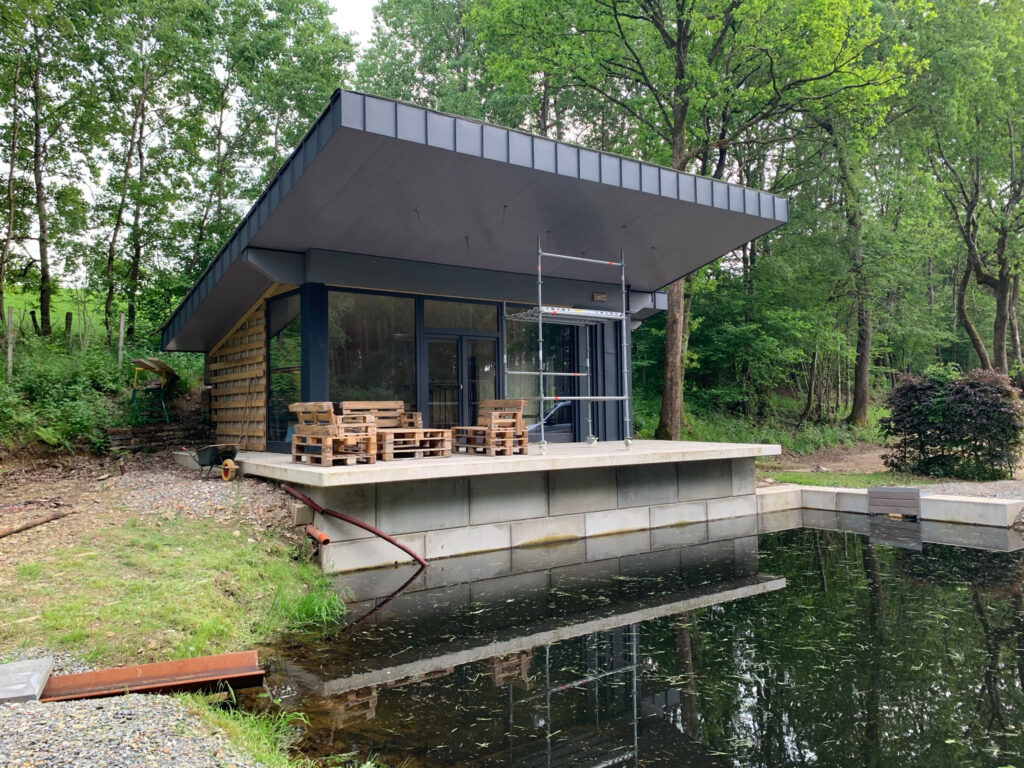 Der Innenraum bietet Ruhe und Entspannung, öffnet sich zur überdachten Terrasse und bietet einen malerischen Blick auf den Weiher. Edle Materialien wie Schiefer und Massivholz sorgen für eine warme, natürliche Ausstrahlung, während die Außenwände mit Trespa-Platten in einem dynamischen Muster verkleidet sind, das sich perfekt in die Landschaft einfügt.